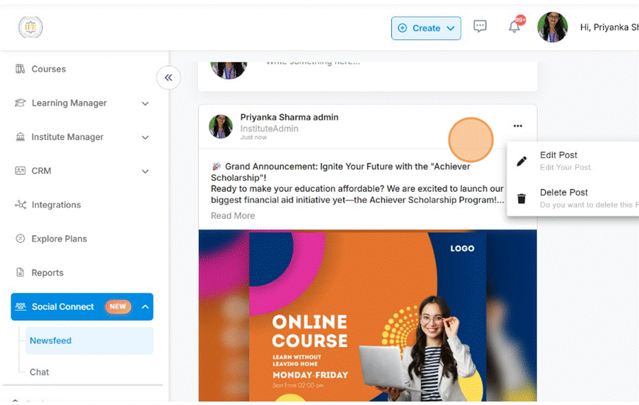 Want to share announcements, updates, or insights with your learners and instructors? Here’s how to create a post using the Social Connect (Newsfeed) feature.