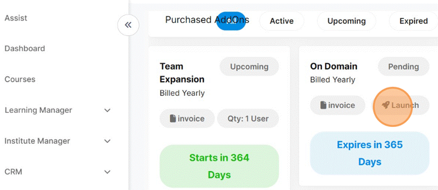 Go to See Your Purchased Addons (or equivalent), find the On-Domain plan you just bought, and click Launch / Activate.